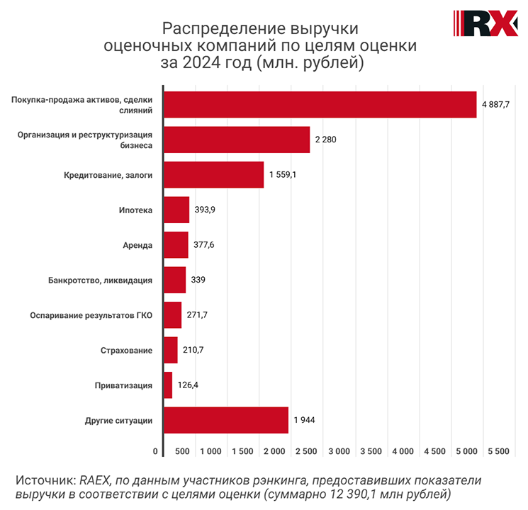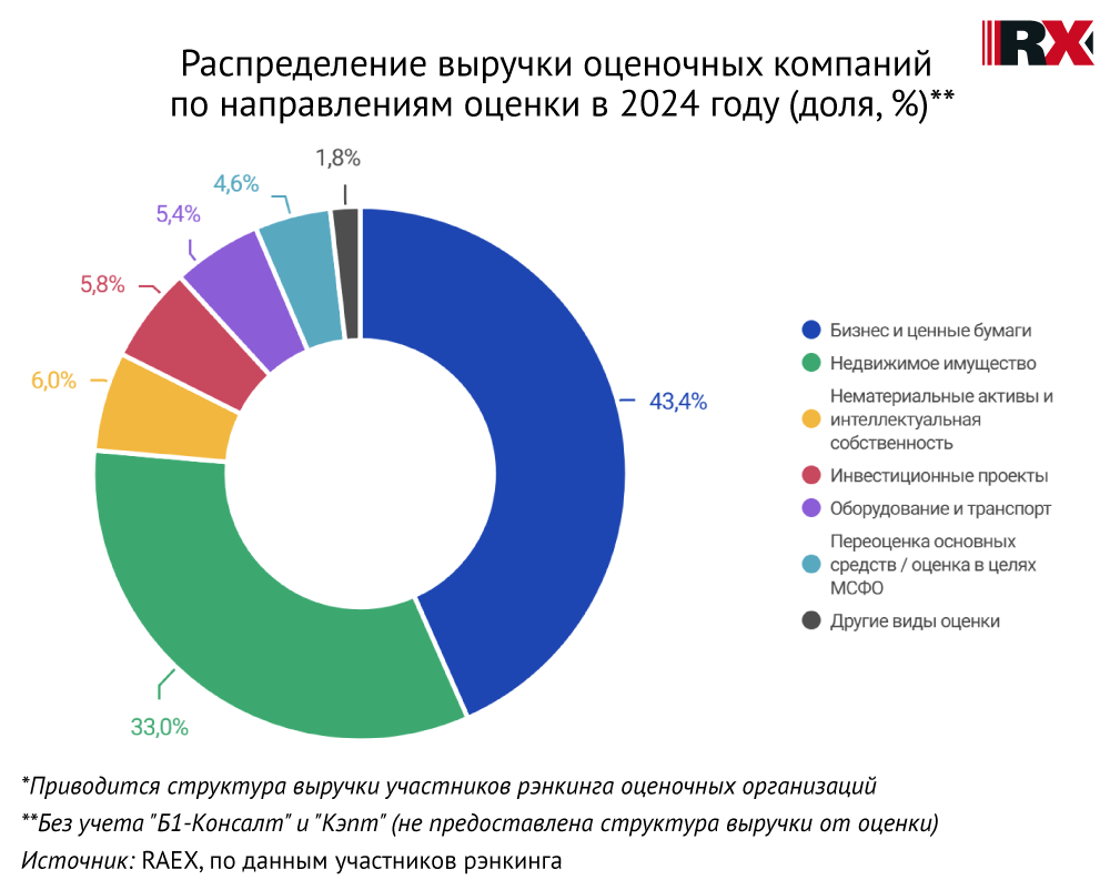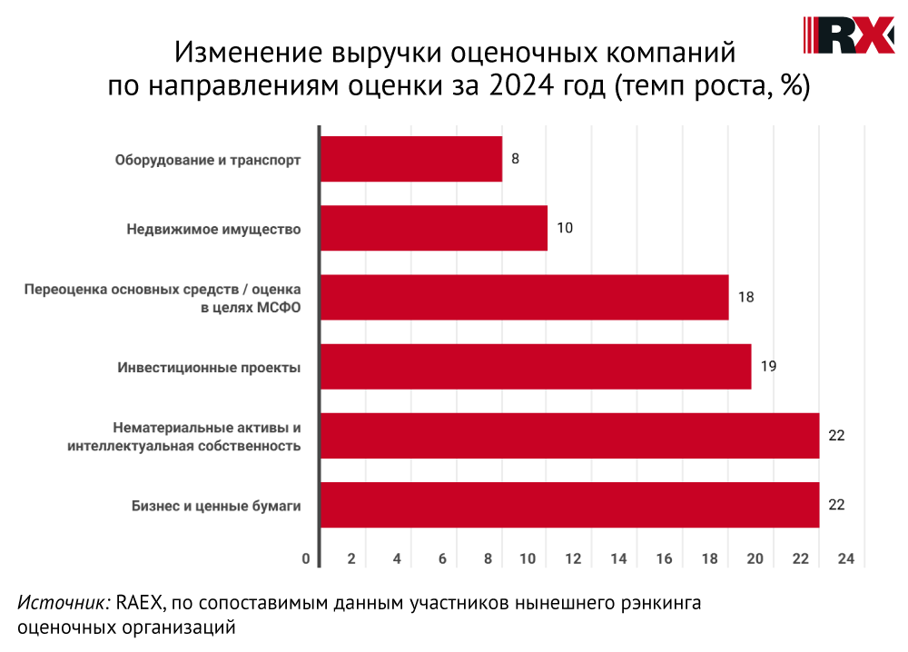 По данным участников рэнкинга наибольший объем выручки от оценочных услуг традиционно сосредоточен в сфере оценки бизнеса и ценных бумаг. Суммарные доходы от услуг этого направления составили в 2024 году 5,667 млрд рублей или 44 % от всей выручки по рэнкингу, увеличившись, по сопоставимым данным, на 22 %. Из всех участников рэнкинга в этом сегменте работает 111 компаний. По данным 92-х из них, число отчётов в этом направлении оценки составило за год минимум 9 102 штуки. Среди причин спроса на оценку бизнесов и определения рыночной стоимости ценных бумаг — процессы консолидации и сделки с активами, привлечение инвестиций и размещения капиталов.