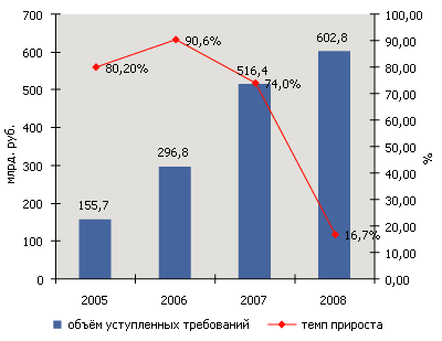 В 2008 г. для рынка факторинга, как и для экономики в целом, настали сложные времена: впервые за последние пять лет темпы роста рынка резко замедлились, говорится в исследовании, подготовленном "Экспертом РА". Если в 2007 г. рынок вырос в 1,7 раза, то в 2008 г. прирост составил лишь 16,7%. Доля факторинга в ВВП России за 2008 год составила 1,44%, она немного уменьшилась по сравнению с 2007 годом (1,56%). Снижение доли факторинга в ВВП связано с тем, что факторинг как инструмент фондирования является более гибким по сравнению с банковским кредитованием. <При ухудшении макроэкономической ситуации в стране факторинговые компании <свернулись>, т. е. сократили объемы предоставленного финансирования быстрее относительно финансовых институтов, предоставляющих более <длинные> деньги>, - комментирует ведущий эксперт департамента рейтингов финансовых институтов "Эксперт РА" Станислав Волков. Годовой объем денежных требований, фактически уступленных Факторам, достиг 602 млрд. руб.