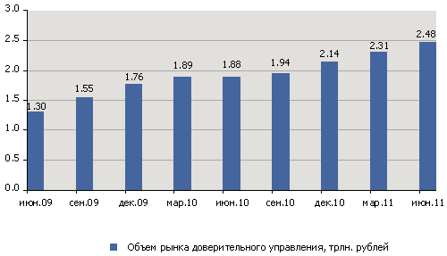 Рейтинговое агентство «Эксперт РА» подготовило обзор рынка коллективных инвестиций и доверительного управления за 1 полугодие 2011 года. Как показало исследование, по итогам первого полугодия рынок доверительного управления и коллективных инвестиций увеличился на 16% с 2,1 до 2,5 трлн. рублей.