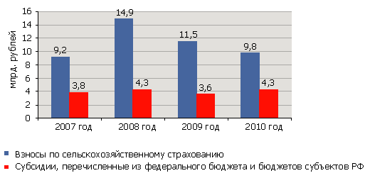 Лето 2010 года показало полную несостоятельность существующей системы сельскохозяйственного страхования. На борьбу с последствиями природных катаклизмов было выделено 35 млрд. рублей из федерального бюджета и 11 млрд. рублей из региональных бюджетов, тогда как суммарные выплаты страховщиков были равны лишь 7,7 млрд. рублей. При этом уровень выплат в сельскохозяйственном страховании с господдержкой составил лишь 72,6% (хотя по логике страхования уровень выплат должен был существенно превышать 100%), в страховании без господдержки – 137,7%.
