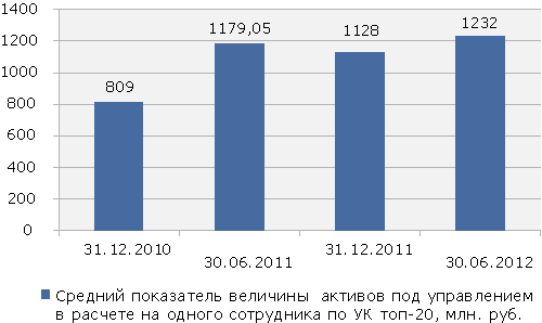 В качестве показателя эффективности бизнеса УК «Эксперт РА» рассматривает отношение объема активов под управлением к численности персонала УК, т. к. расходы на персонал в УК – являются основными в структуре затрат. Поэтому, по мнению агентства, динамика штата в сравнении с динамикой объема бизнеса во многом свидетельствует, о технологичности и эффективности УК. В среднем за 1 полугодие 2012 года объем активов под управлением, приходящийся на одного сотрудника, вырос на 29 млн. рублей и достиг 497 млн. рублей. В двадцатке лидеров этот тренд еще заметнее: прирост составил 9% (+127 млн. рублей). Если рассматривать период полтора года, эта тенденция еще заметнее: с 31.12.2010 по 30.06.2012 темпы прироста активов в расчете на одного сотрудника по топ-20 составили 52%. Причем большинство УК-лидеров по этому показателю специализируются на управлении пенсионными средствами либо на ЗПИФах.