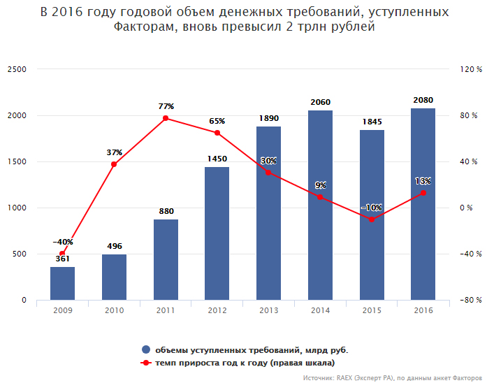«В 2016 году рынок факторинга вновь превысил 2 трлн рублей, показав восстановительный рост на 13%» – говорится в исследовании «Российский рынок факторинга в 2016 году: в ожидании госзаказа», подготовленном рейтинговым агентством RAEX (Эксперт РА). Однако с учетом инфляционной составляющей в реальном выражении сокращение рынка относительно результата 2014 года достигло порядка 10–15%, а доля факторинга в ВВП за два года снизилась с 2,6 до 2,3%.