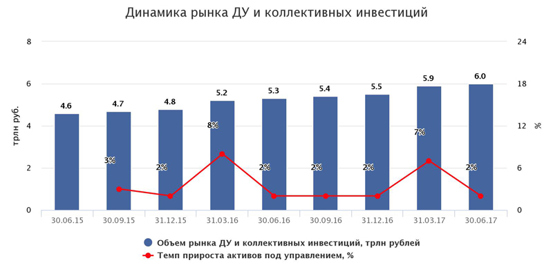 Рейтинговое агентство «Эксперт РА» подвело итоги рынка доверительного управления во 2 квартале 2017 года. По оценкам агентства рынок ДУ и коллективных инвестиций вырос на порядка 2%, достигнув в объеме около 6 трлн рублей. Драйвером рынка в условиях снижения ставок депозитам стали средства розничных и состоятельных частных клиентов