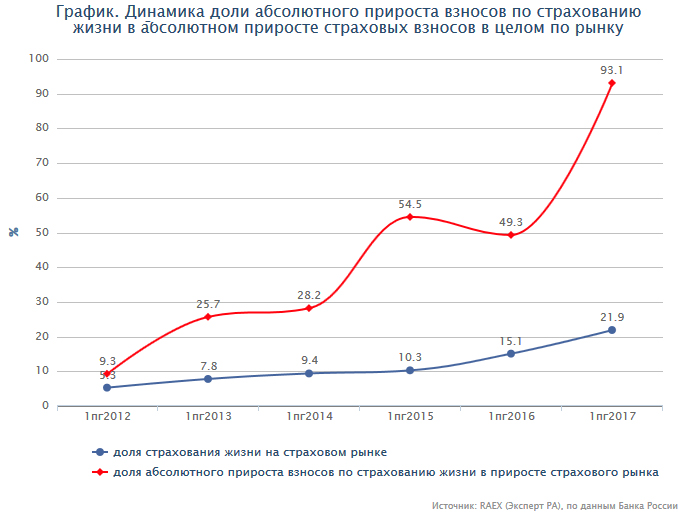 «Страхование жизни по итогам 1 полугодия 2017-го стало лидером рынка по объему премий, обогнав по сравнению с аналогичным периодом 2016 года ОСАГО и ДМС. Этот вид обеспечил 93% абсолютного прироста страхового рынка», – говорится в исследовании «Страхование жизни в России: элементы неопределенности», подготовленном рейтинговым агентством RAEX (Эксперт РА).